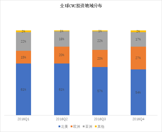 2016年第四季度,CVC交易北美占比54%,比第三季度下降3个百分点;在欧洲进行的CVC交易占比达到27%,相对来说略有增长,而其他地区则均有一定程度的下滑。
