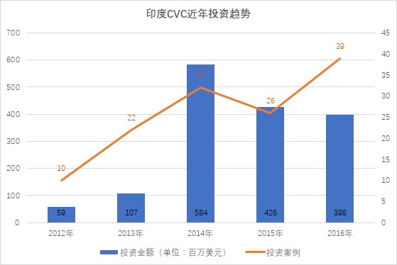 印度的CVC投资在2012年尚处于起步阶段,只有10个投资案例和不到6000万美元的投资额。近几年投资案例数量不断增长,2016年CVC投资案例39起,投资金额3.98亿美金,案例相较2015年增长了50%。但相比美国和英国,印度CVC投资数量与金额都不大,项目平均投资规模仅为美国和英国的一半,约1000万美元。