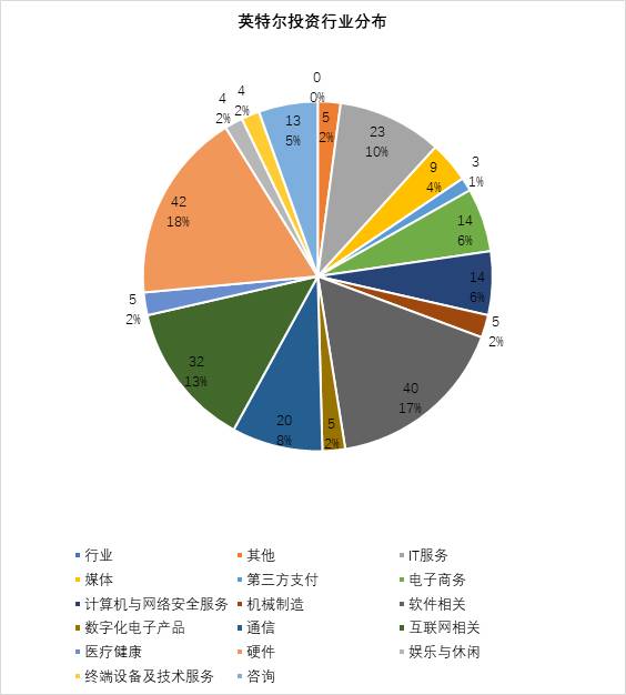 基于私募通数据库统计的234起投资事件的行业分布来看,硬件、软件和互联网相关行业成为最受英特尔投资青睐的三大行业,所完成案例数量占比高达18%、17%和13%。由此可见,英特尔的投资多数与母公司行业高度相关,为战略布局服务。