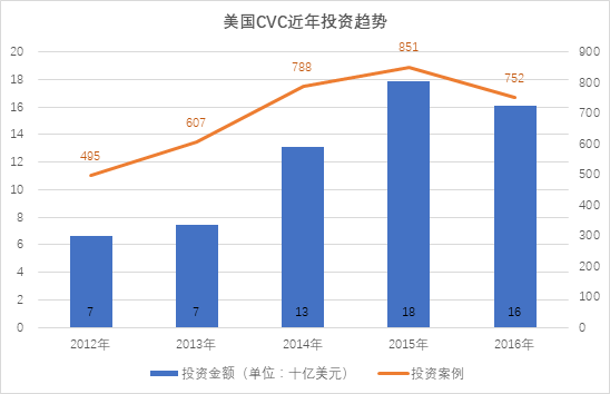 美国的CVC投资在2012年就已发展成熟,投资案例495起,投资金额70亿美金。2014年后,CVC投资的数量与金额增幅较小。2016年面临全球资本寒冬,相比2015年投资案例数与金额都有所减少,其中投资案例数减少12%,投资金额减少11%,但项目平均投资基本持平,约为2100万美元。