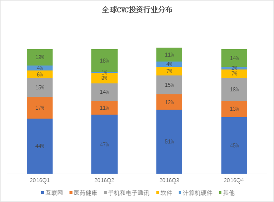 在2016年第三季度,互联网行业占据了CVC交易的51%。在2016年第四季度,互联网和手机行业共占据了交易份额的63%,其中手机行业增加到交易份额的18%。这与传统风险投资近年来投资的行业分布相差不大。