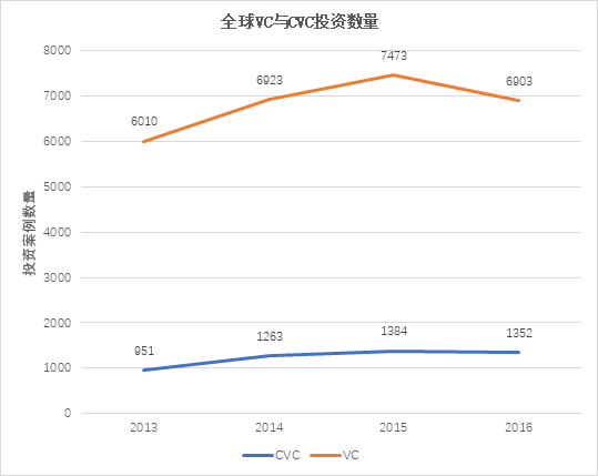 从投资案例数量上看,2015年共发生7473笔风险投资,CVC投资数量占比达到19%。2016年度,在资本寒冬的大形势下,风险投资行业总交易活动下降了8%,CVC活动下降了2%。