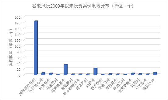 从地域上看,谷歌风投与美国其他风险投资机构一样,所投初创企业主要分布在加利福尼亚、马萨诸塞和纽约这三大洲。其中,对加利福尼亚州的投资案例高达184起,超过投资总量的半数。此外,谷歌风投对美国境外的初创企业也有所涉足。