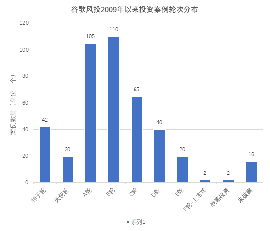 从投资轮次上看,谷歌风投主要投资处于A轮、B轮、C轮的初创企业,其中B轮投资案例最多,达110起,占总投资数量的26%,与传统风险投资机构相类似。