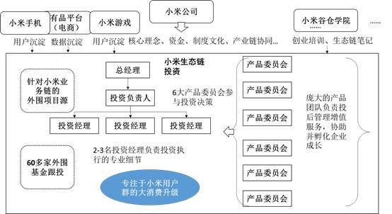 基于产品驱动的生态链投资逻辑,小米生态链投资管理模式与传统的投资机构或者一般企业的投资业务部门相比也有较大不同。一方面,其投资团队相对人数较少,目前仅有2-3名,主要负责投资过程中的专业细节操作。而投资决策团队除投资负责人外,还有6大产品委员会深入参与。另一方面,小米生态链投资拥有庞大的投后团队,协助被投企业做产品孵化,并纳入小米生态链产生协同作用,目前,每年的投后大会已经形成一定的影响力品牌规模效应。