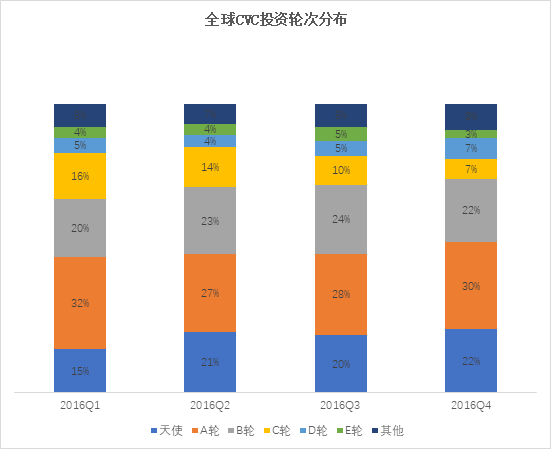 在2016年下半年,CVC参与的所有交易中有近一半是早期阶段(天使轮和A轮)。相比第一季度,天使轮投资逐渐上升。B轮投资基本不变,C轮投资由第一季度的16%下降到四季度的7%。这与CVC倾向于投资早期阶段的学术研究发现一致,也体现了CVC的风险容忍度较高这一特征。