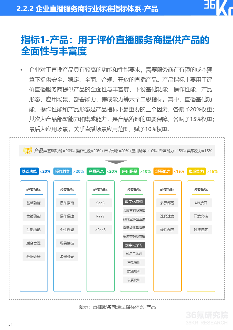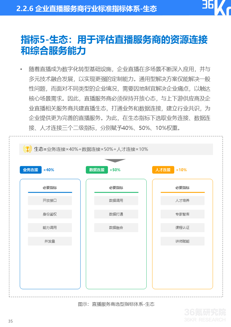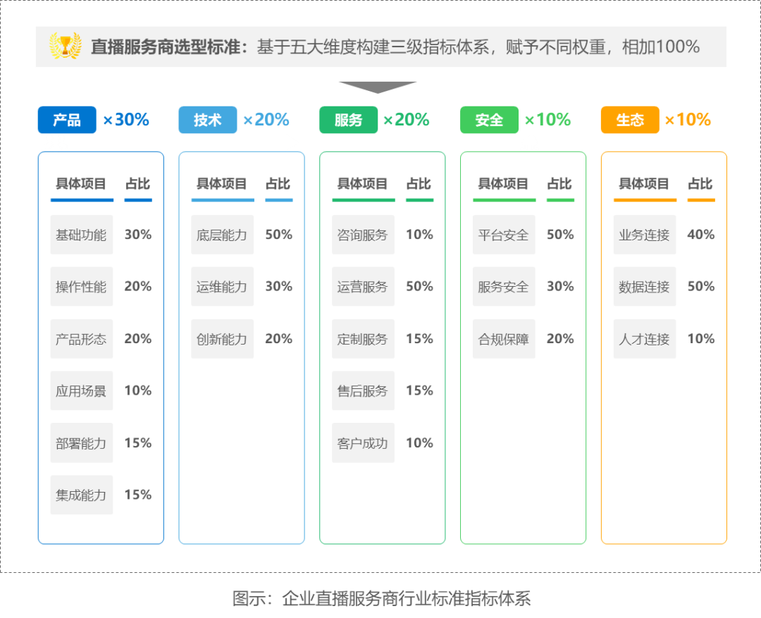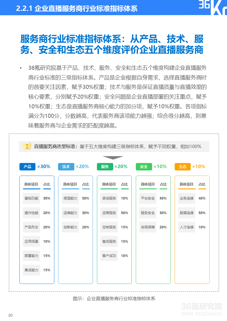 36氪研究院基于产品、技术、服务、安全和生态五个维度构建企业直播服务商行业标准的三级指标体系。产品用于评价直播服务商提供产品的全面性与丰富度;技术用于评估直播服务商的核心技术能力;服务用于评估直播服务商的全链路服务能力;安全用于评估直播服务商的直播质量安全和数据安全保障能力;生态用于评估直播服务商的资源连接和综合服务能力。