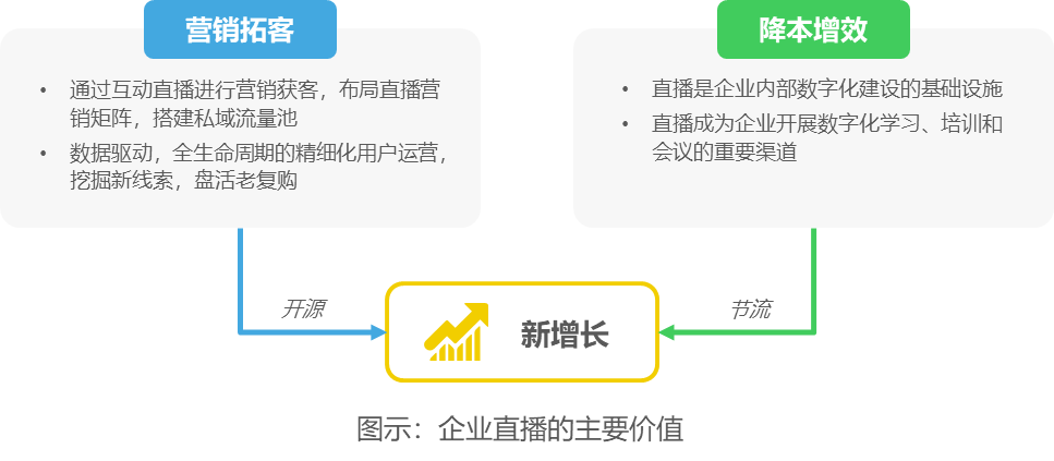 企业应用直播为数字化转型赋能,通过开源与节流并举,实现新增长。一方面,利用互动直播进行营销获客,布局直播营销矩阵,搭建私域流量池,开展数据驱动的全生命周期精细化用户运营,增加企业营收;另一方面,将直播作为企业内部数字化工具,开展直播数字化学习、数字化培训和在线会议,打破时间和空间限制,降低差旅成本,提高内外部沟通效率,实现降本增效。