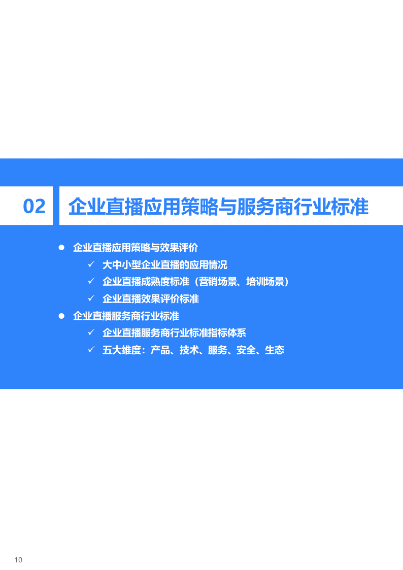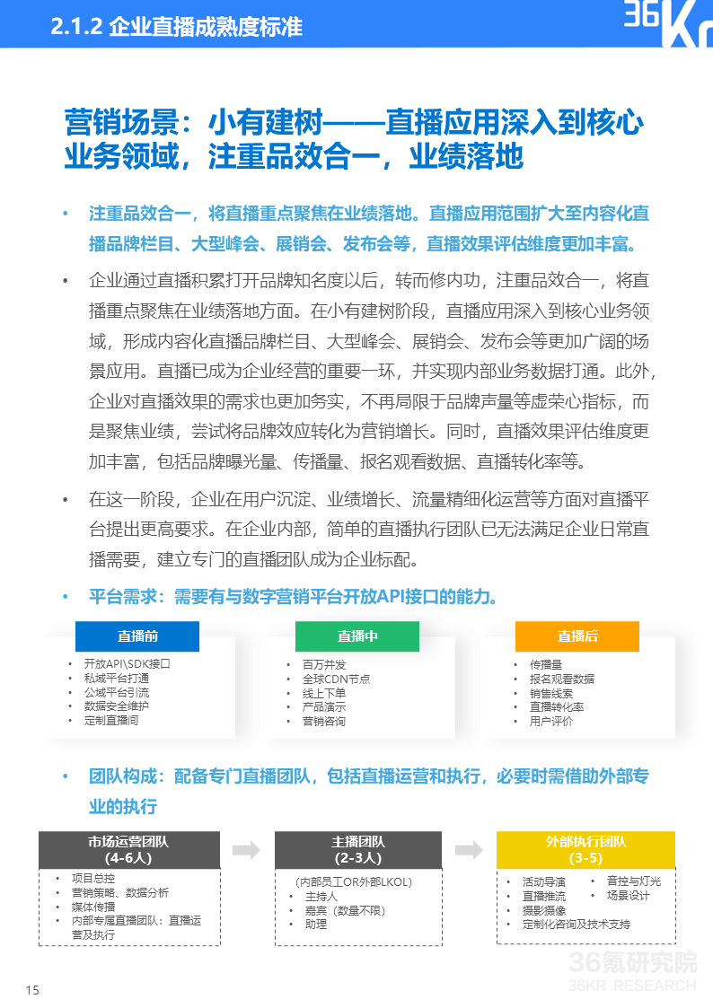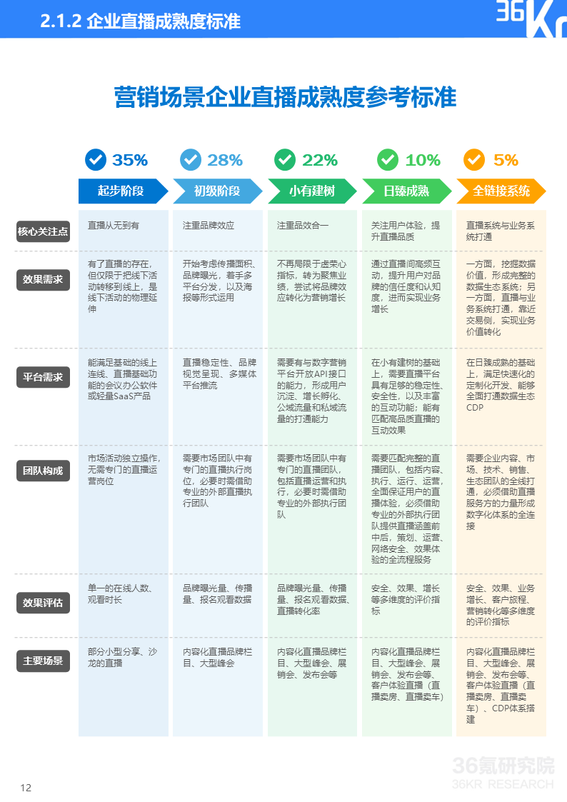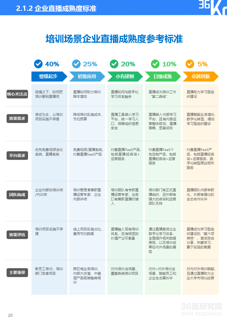 直播研究院和36氪研究院将企业直播分为营销和培训两大类应用场景,并将直播应用成熟度由浅至深划分为五大阶段,从核心关注点、效果需求、平台需求、团队构成、效果评估、主要场景等维度来描摹各阶段主要特征,帮助企业评估自身直播应用成熟度及未来所需提升方向。在实践中,因直播通常与企业具体业务相结合,应用场景和需求可能与标准化指标存在一定变通,企业可依据实际情况灵活使用该标准。