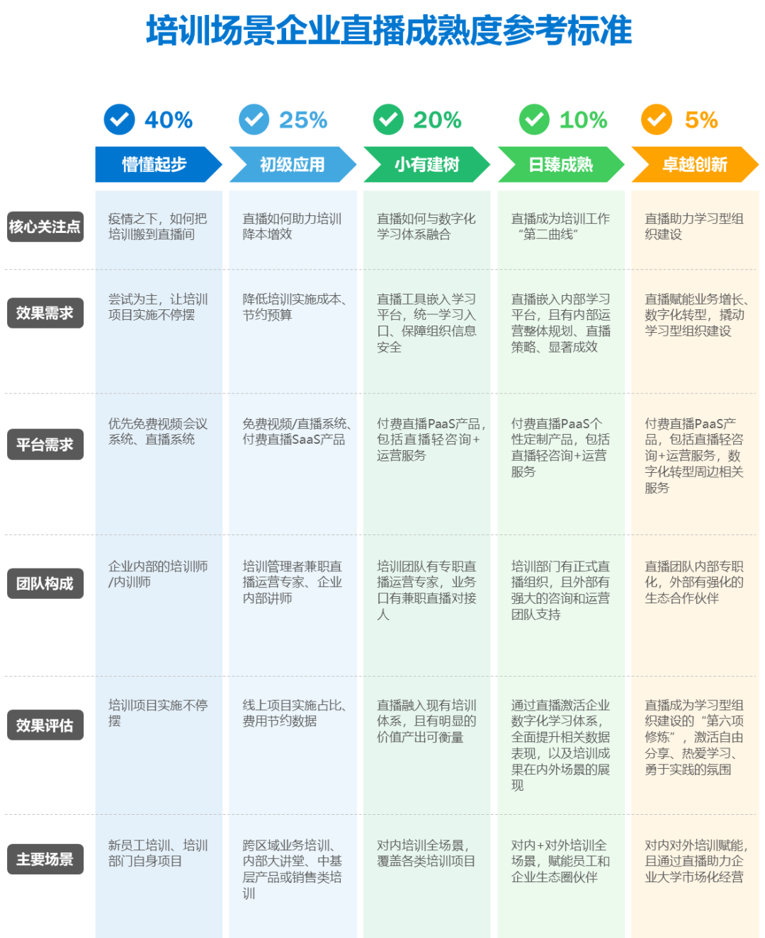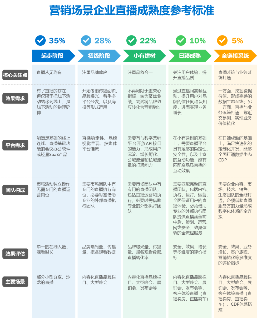 企业直播成熟度标准将直播应用划分为五个阶段,帮助企业评估自身直播应用成熟度