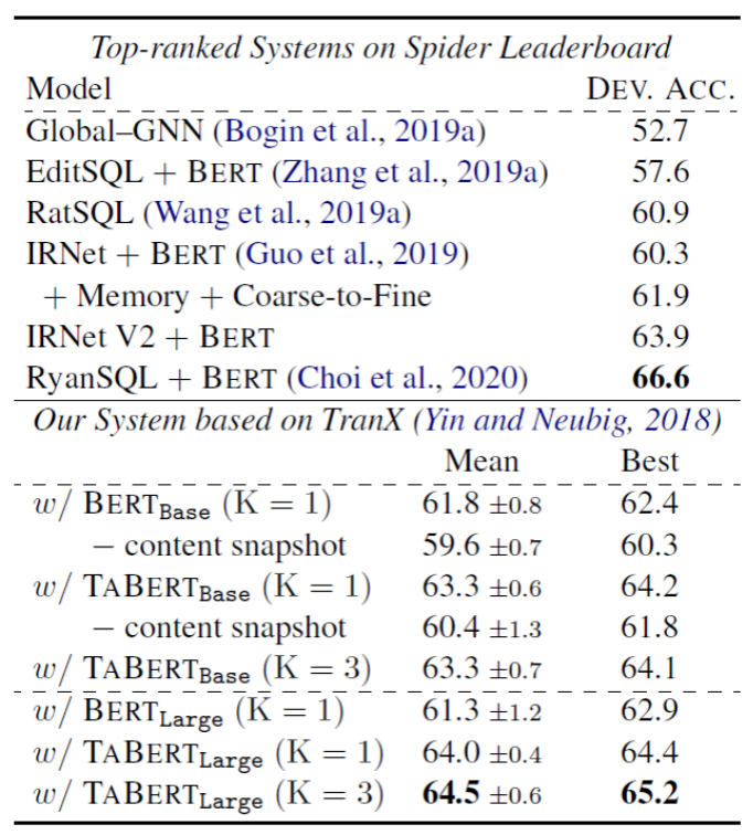 在Spider数据集上,解析器基于TranX构建,并使用和IRNet模型类似的SemQL语法,而TaBert具有更简单的解码器。有趣的是,可以观察到,只使用Bert_base的性能(61.8)与使用Bert增强的IRNet模型(61.9)性能相当。这说明了TaBert的基本解析器是一个有效的baseline。使用TaBert_large(K=3)/进行编码时,模型的准确率达到了65.2,比使用基本模型提升了2.8%,虽然排行榜上其他的系统拥有更复杂的模型,但是TaBert在开发集上的结果已经接近最佳提交(RyanSQL+Bert)的结果。这说明使用TaBert作为表示层可以得到更好的效果。