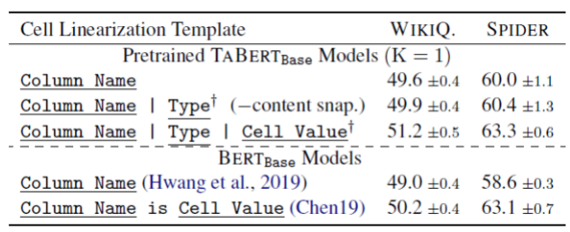 TaBert对表格进行线性化作为Transformer的输入,表3(上半部分)给出了不同线性化方法的效果,作者发现,添加类型信息和内容快照可以提高模型性能,因为他们提供了更多列的信息。