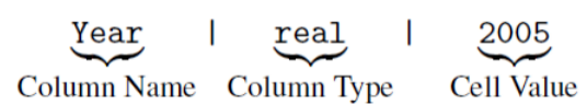 TaBert对内容快照中的每一行进行线性化,作为Transformer的输入。每一个值表示成三部分:列名、类型和单元值,中间使用“|”分割。如上图的B,R2行的2005就可以表示为: