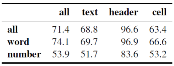 同时作者比较了现有的其他线性化方法(表3下半部分):Hwang等人使用Bert对连接的列名进行编码以学习列的表示,但是不编码单元值产生的性能较差。Chen等人提出了一种“自然”的线性化方法,来判断一个自然语言描述是否包含了表中列出的信息。