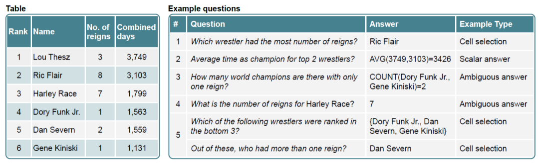基准数据集:WikiTableQuestions是一个弱监督语义解析数据集,包含来自维基百科的22033条句子和2108个半结构化的网络表格。与Spider数据集相比,WikiTableQuestions并不涉及夺标的连接,但是需要对表中的一系列条目进行组合、多步推理。