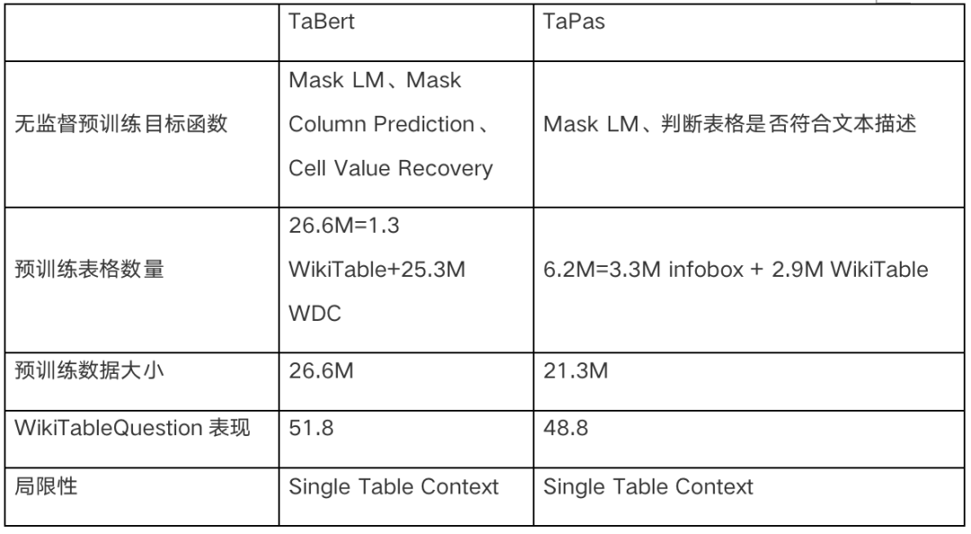 Pengcheng Yin等人提出了TaBert模型,它是一个用于联合理解自然语言描述和(半)结构化表格数据的与训练方法。TaBert在BERT之上进行构建,能够将表格结构线性化以适配基于Transformer的BERT模型。