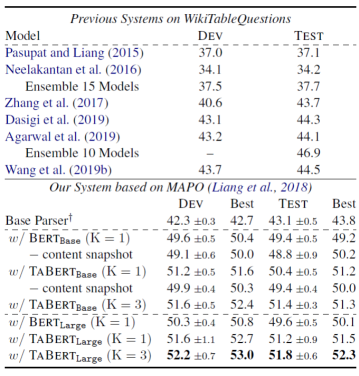 作者基于BERT_large和BERT_base训练了两个不同的版本:TaBert_large和TaBert_base。并且对比了不同内容快照大小的情况(K=1和K=3),同时与只使用BERT的情况进行对比(可以看作是没有进行与训练的K=1的情况)。