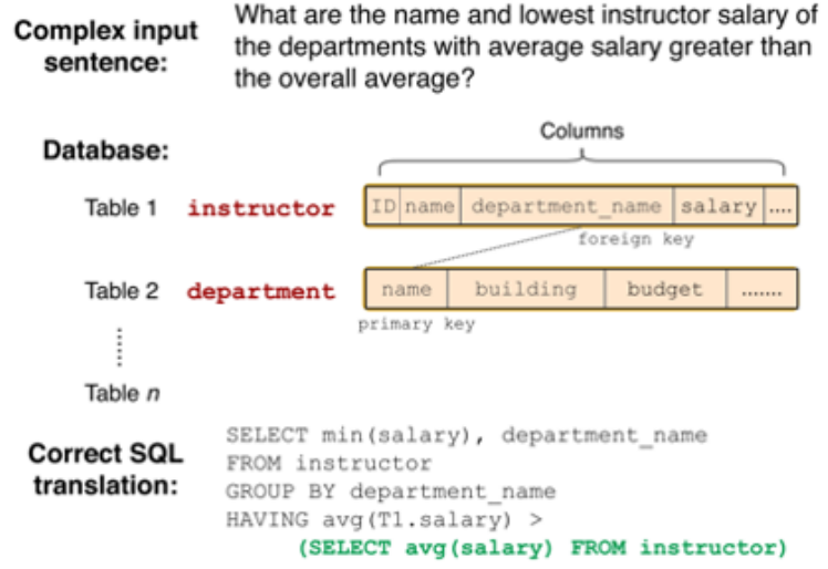 在这里,我们给出Text-to-SQL任务一个相对正式的定义:在给定关系型数据库(或表)的前提下,由用户的提问生成相应的SQL查询语句。下图是一个具体的实例,问题为:有哪些系的教员平均工资高于总体平均值,请返回这些系的名字以及他们的平均工资值。可以看到该问题对应的SQL语句是很复杂的,并且有嵌套关系。