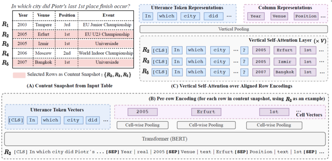由于表格可能包含大量的行,但是只有少数的几行与输入描述相关,对所有的行进行编码是没必要的同时也是难以计算的。因此TaBert使用只包含几行预描述最相关的“内容快照”,它提供了一个有效的方法,能够从列值计算出列的表示。