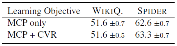 TaBert使用了两个预训练目标:遮蔽列预测(MCP)和单元值恢复(CVR)。表4给出了不同的预训练目标下TaBert的性能。可以看出,使用CVR来辅助MCP得到了略微的提升,这表明CVR可以使列的表示在附加单元值的情况下更具有代表性。