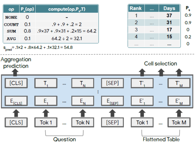 Jonathan Herzig等人提出的TaPas,是一种不需要生成逻辑表达式,直接通过表格回答问题的方法。TaPas从弱监督中得到训练,并通过选择表格单元格和选择性地应用相应的聚合运算符来预测结果。TaPas扩展了BERT的结构,使用从Wikipedia爬取的表格和文本片段进行预训练,并且是TaPas端到端的模型。