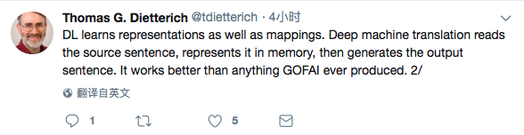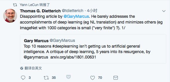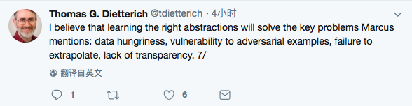 但跟Marcus同为纽约大学教授的Yann LeCun却不以为然,就在刚才,他转发了前美国人工智能协会主席Thomas G. Dietterich反驳Gary Marcus的推文,以表达观点。