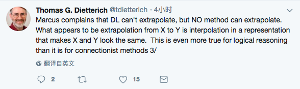 “Marcus抱怨深度学习无法进行推理,但目前无论哪种人工智能也都做不了推理。从X到Y的推理过程,实质上更像是从X和Y的表示中找到使其看起来相同的插值。对于逻辑推理来说,这比起联结主义的方法更真实。3/”