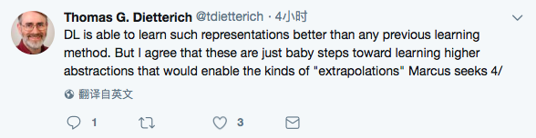 “相比先前的任何学习方法,深度学习可以把表征学得更好。但我同意,这还只是学习更高层的抽象的很小一步,后者将使Marcus所要的各种“推理”成为可能。4/”