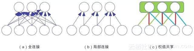 那么全连接的参数个数又是多少呢?仅仅考虑两层网络的情况下,其连接个数为(32×32×3)×(32×32×3)=9,437,184。对比这二者的数字可以发现,局部连接虽然降低了连接的个数,但整体幅度并不大,需要调节的参数个数依然非常庞大,因此还是无法满足高效训练参数的需求。