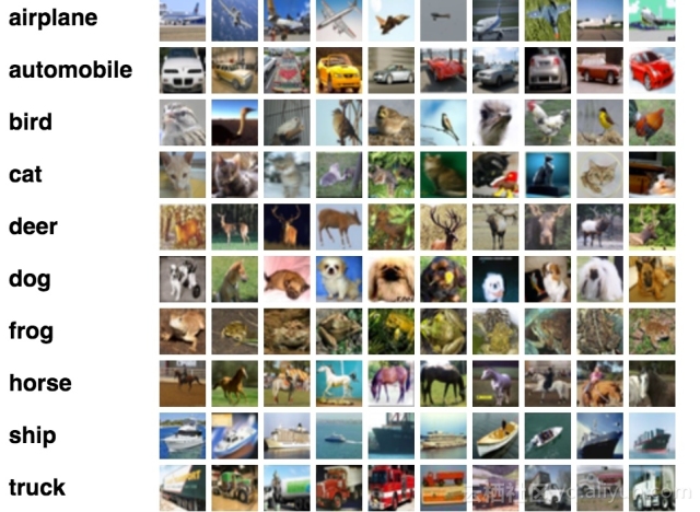 下面我们将一一讲解卷积神经网络中这几个层的设计理念。在讲解之前,我们有必要补充介绍一下大名鼎鼎的CIFAR-10图像集,因为后面的案例会频频用到这个数据集。