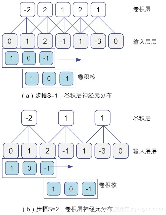 (2)步幅(stride):即滤波矩阵在输入矩阵上滑动跨越的单元个数。设步幅大小为S,当S为1时,滤波器每次移动一个像素的位置。当S为2时,每次移动滤波器会跳过2个像素。S越大,卷积得到特征图就越小。以一维数据为例,当卷积核为[1,0,-1],输入矩阵为[0, 1, 2, -1, 1, -3, 0]时,图11-5显示了步幅分别为1和2卷积层的神经元分布情况。