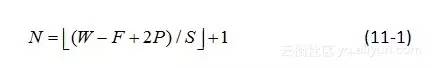 综上所述,在构造卷积层时,对于给定的输入数据,如果确定了卷积核的大小,卷积核的深度(个数)、步幅以及补零个数,那么卷积层的空间安排就能确定下来。以一维数据为例,假设数据的大小(数据元素的长度)为W,卷积核的深度为F,步幅大小为S,补零的数目为P,那么对于每个卷积核,在它与输入数据实施卷积操作后得到特征图谱,它包含的神经元个数N可以用(11-1)公式计算得到。