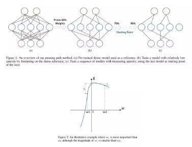 量化技术可以通过简化计算单元(浮点计算单元->定点计算单元)提升推理速度。稀疏化( Pruning ) 技术则是通过对神经网络中的通路进行裁剪来减少真实计算量。我们很自然的将这两个技术融合到了一起,来获取极限的理论加速比。在剪枝过程中,我们采用了渐进式的训练方法,并结合梯度信息决定网络中路径的重要程度。在 ResNet 结构上,我们可以做到 90% 稀疏度下的近似无损压缩。
