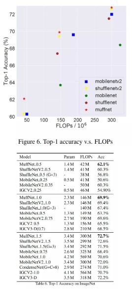 我们提出的新型网络由于每个单元的计算比较密集,并不存在过多的碎片操作,是非常适合在通用硬件上运行的。在公开数据集 ImageNet 上,我们在 40MFLops 计算量上相比目前业内最优的 shufflenet v2 结构,准确度提升了 2%。