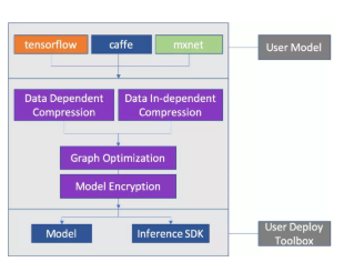 如上图所示,首先,我们的工具输入支持多种模型格式(TensorFlow,Caffe,Mxnet 等)。其次,我们提供了两种不同的模型量化方法,一种是支持不同任务(分类,检测,分割等)的数据依赖型压缩方法(Data Dependent Compression),适用于对数据安全要求不是很高,希望追求精度最大化的业务;另一种是数据非依赖压缩方法(Data Independent Compression),适用于对数据安全要求高,或者业务逻辑不是特别复杂的场景。