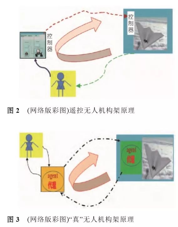 从上面的分析中可知,遥控飞行无人机(remotely piloted vehicle)与“真”无人机(unmanned aerial vehicle) 其内涵和本质是有区别的。遥控飞行的无人机的构架原理图见图2,“真”无人机的构架原理图见图3。从图2和3可直观看到二者的不同,遥控飞行无人机是在人直接控制下工作的,即人在其工作环中;而无 人机是在人授权下工作的,人在其工作环之外,而不是在工作环之中,这一本质上的差别就导致了二者在设计中系统结构、控制功能和实现方法的不同。