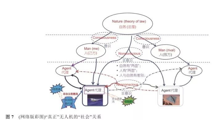 无人机在自然界能作为一完整独立的个体,它应融入自然界中,它应与自然界、作为其主人的人和对手有密切的关联,否则难以达到自主智能的高境界,无人机本体与自然和人以及代理同时有关系才能实现“真正”的自主与智能功能。图7示出了“真正”无人 机的“社会”关系。