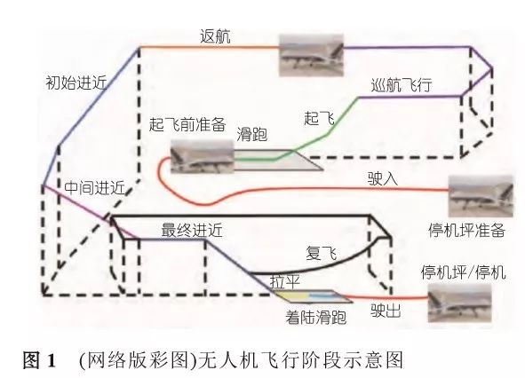无人机的两种形式表达:unmannedaerialvehicle和uninhabitedaerialvehicle仔细探究其含义是有区别的,unmanned从字面上有两个含义: 其一是直接的含义,无人的,飞机上无人;其二是无人操纵的;而uninhabited只有飞机上无人的含义。从unmanned字面上讲,无人 机应同时具备两个含义, 即: 人不在飞机上并且人不操控飞机, 飞机能够“正常”飞行,也就是说无人机从起飞准备-滑行-起飞-空中飞行-返场着陆-退出关停的全过程(图1)都可不需要人介入。因此,用“unmanned aerialvehicle”来定义无人机是最合适的,更能体现“真” 无人机的内涵。无人作战飞机(UCAV)的英文表达应为: unmanned combat aerial vehicle。