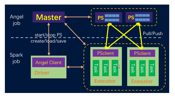 Spark Driver:中央控制节点,负责计算任务的调度和一些全局的控制功能,例如发起创建矩阵、初始化模型、保存模型、写 checkpoint 以及恢复模型命令;