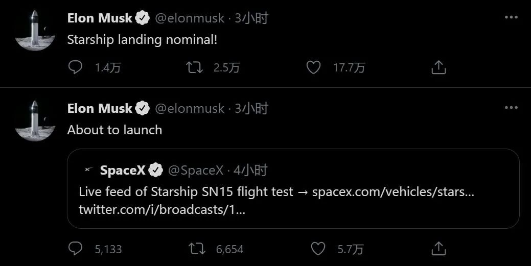 SpaceX 首席执行官、首席设计师伊隆 · 马斯克也立即发推庆祝。
