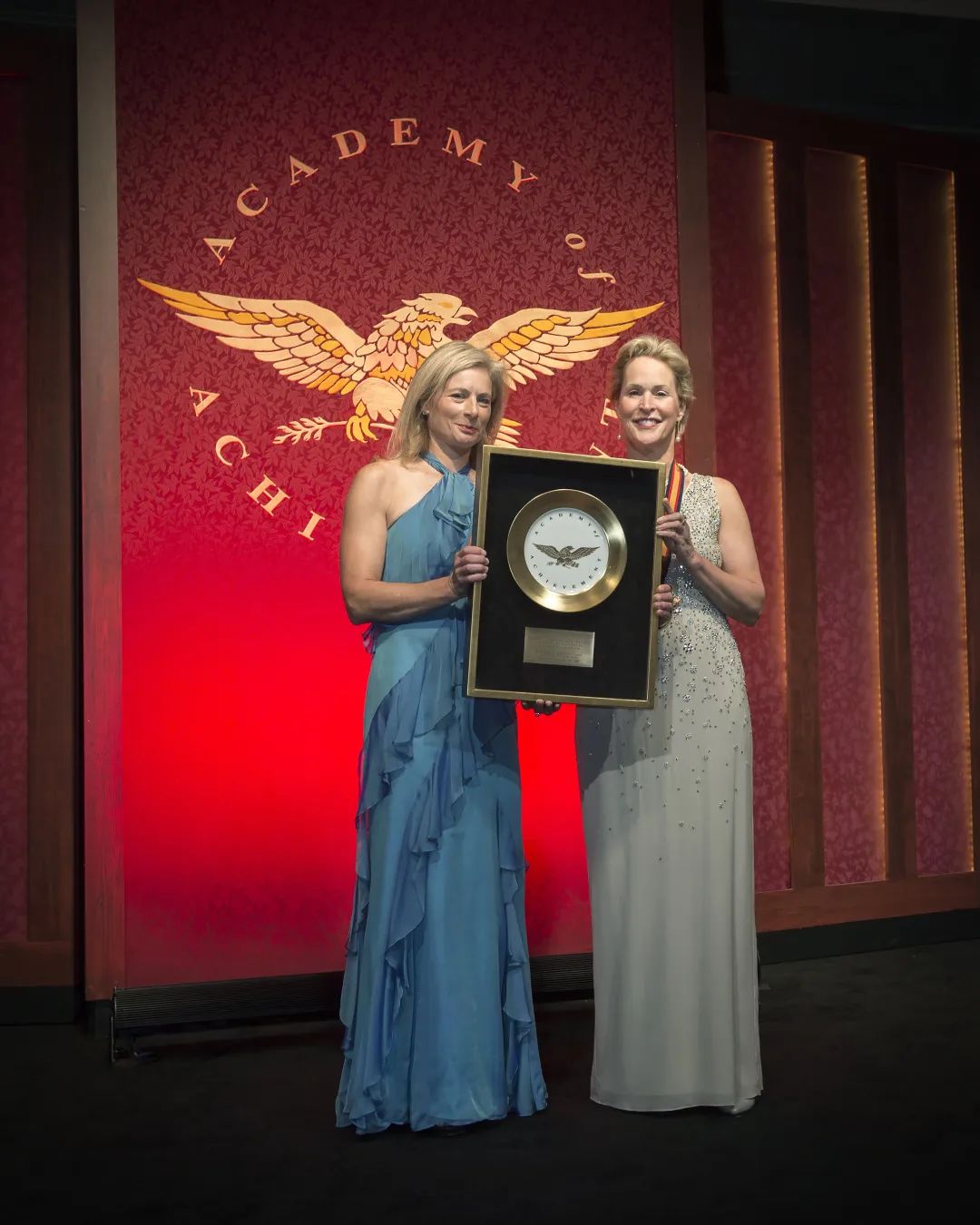 颁奖委员会成员丽莎·兰德尔,理论物理学家,小弗兰克·b·贝尔德,哈佛大学的科学教授,在2014年加州旧金山的金盘宴会上向弗朗西斯·阿诺德颁发金盘奖。