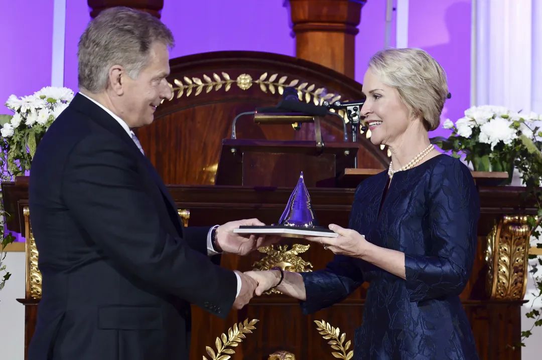 2016 年 5 月 24 日:弗朗西斯·阿诺德博士在赫尔辛基接受芬兰总统 Sauli Niinisto 颁发的千禧科技奖。阿诺德因其在“定向进化”方面的工作而获得了百万欧元的技术奖。(Saukkomaa/Getty)