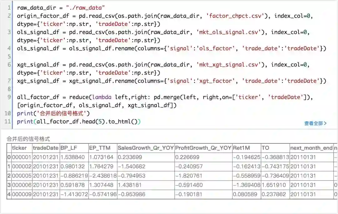 首先,合并第一章节读取的因子文件与第二章节训练的两个模型信号文件,方便后续分析。