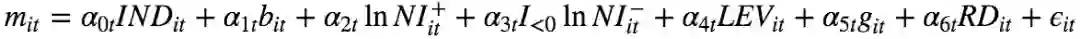 其中, mit为股票i在t时候的对数市值,INDit为行业哑变量,bit为股票对数净资产,NI为公司净利润,这里根据净利润的正负拆分了两个变量,LEVit为公司财务杠杆,即负债除以资产, git为季度同比的营业收入增长率, RDit为开发支出。
