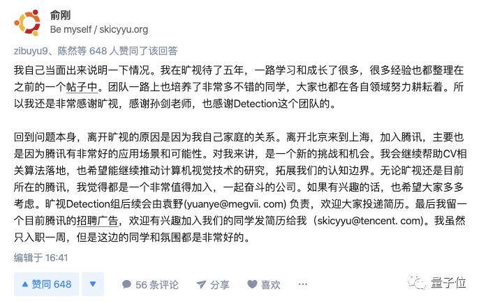 在俞刚对离职情况进行回应之后,他也在知乎上发出了“腾讯光影研究室”的招聘帖。