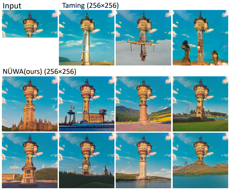 在只有塔的上半部分的情况下,与Taming Transformers相比,NÜWA在对塔的下半部分进行补全时,展现出更丰富的想象力,自主添加了建筑、湖泊、鲜花、草地、树木、山脉等等。