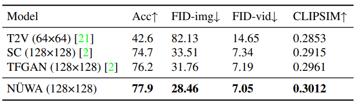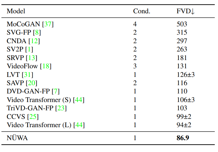 为了进行公平的比较,所有的模型都使用64×64的分辨率。尽管只给了一帧作为条件(Cond.),NÜWA仍将FVD的SOTA得分从94±2推至86.9。