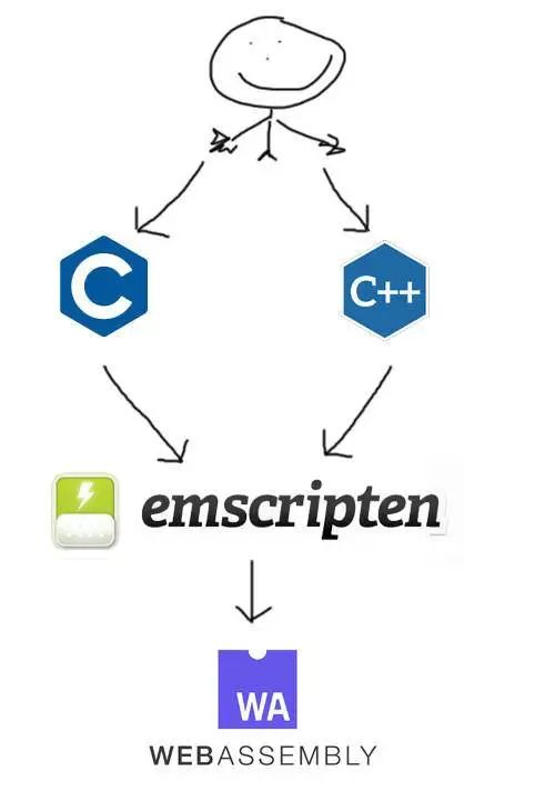 第一步:这里是你和你的开发技能。你使用 C 或 C++ 生成源代码(还可以使用其他语言)。这段代码应该可以解决某个问题,或者完成某段对浏览器中的 JavaScript 来说太过复杂的流程。