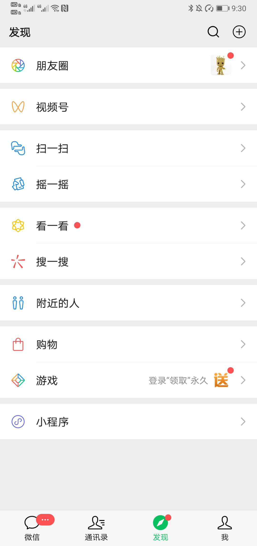 在微信上,视频号入口被放在发现目录里,紧次于朋友圈入口的第二位置;类似朋友圈一样,用户点开发现频道,无论朋友圈还是视频号,内部若有新更的内容,会有小红点提示。