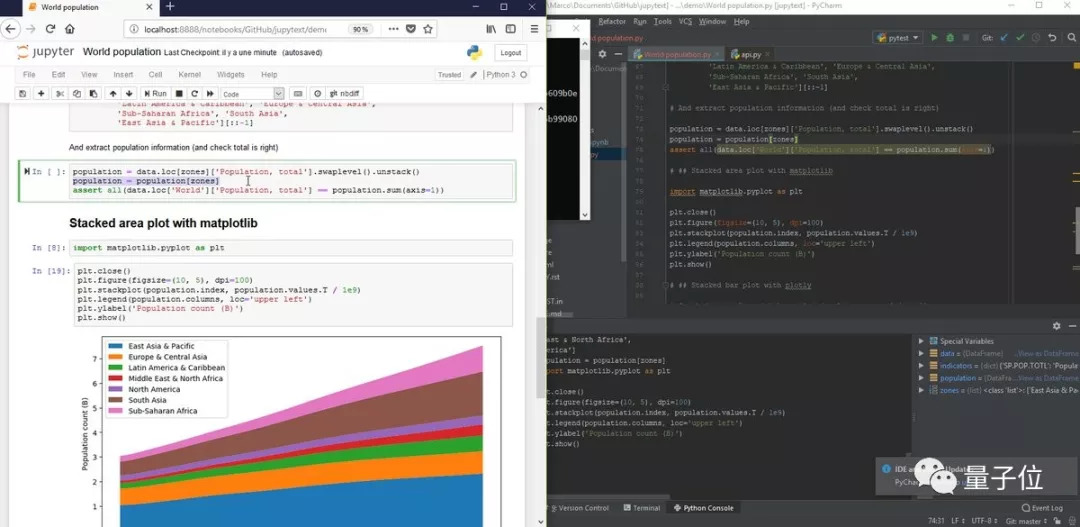 上面就是Jupytext使用过程的一个例子:把一个Jupyter Notebook存储为.ipynb和.py两种文件格式、用PyCharm打开.py脚本来修改代码、保存之后刷新浏览器,就能在Jupyter Notebook里看到新结果了。